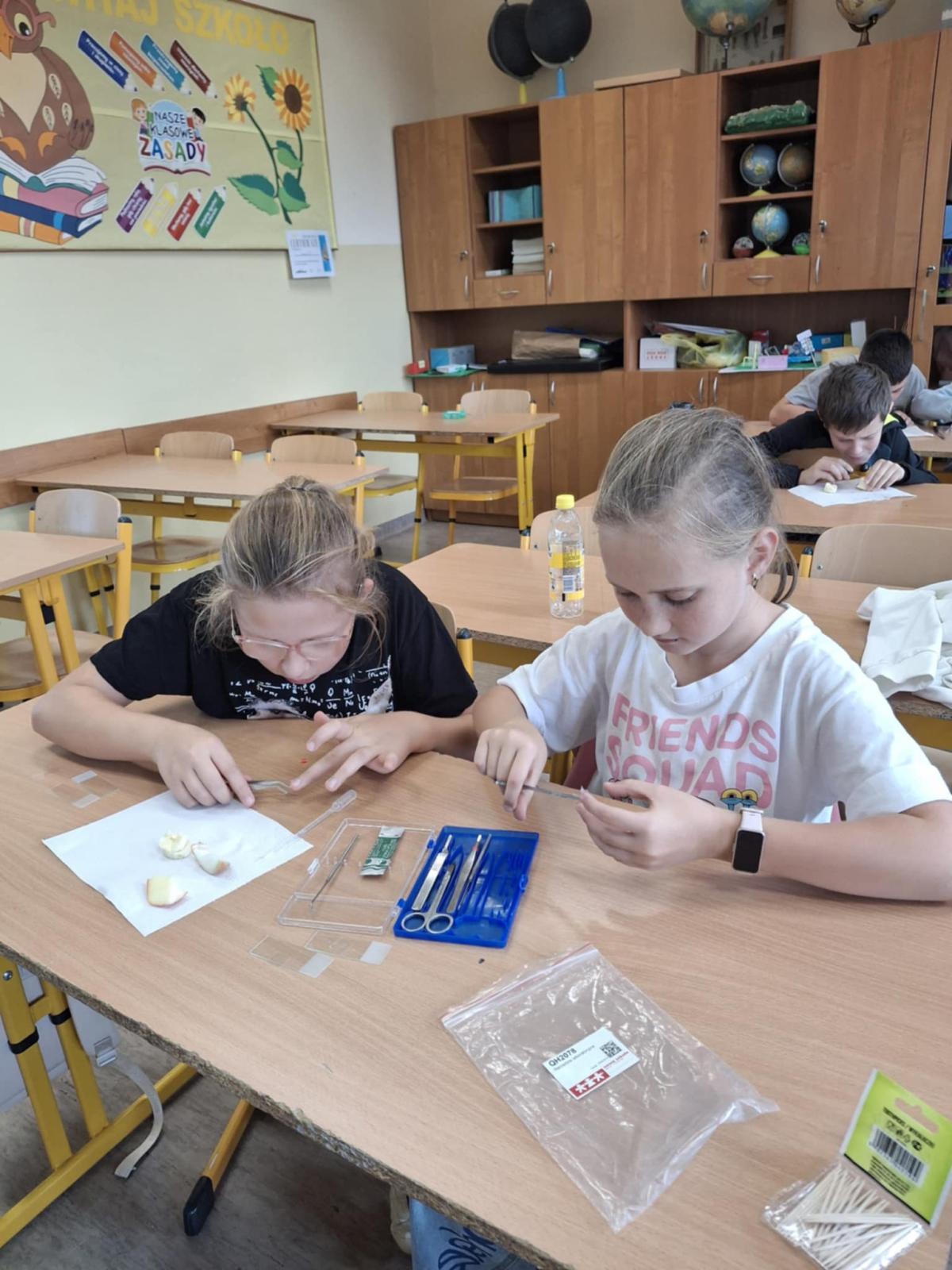 Młodzi badacze przygotowywali preparaty tkanek roślinnych, m.in. skórki z liścia spichrzowego cebuli, miąższu pomidora, jabłka, banana, gruszki oraz marchwi. Największym wyzwaniem okazało się uzyskanie bardzo cienkiego skrawka tkanki – tylko wtedy światło mogło przejść przez preparat, odsłaniając szczegółową strukturzę komórek.